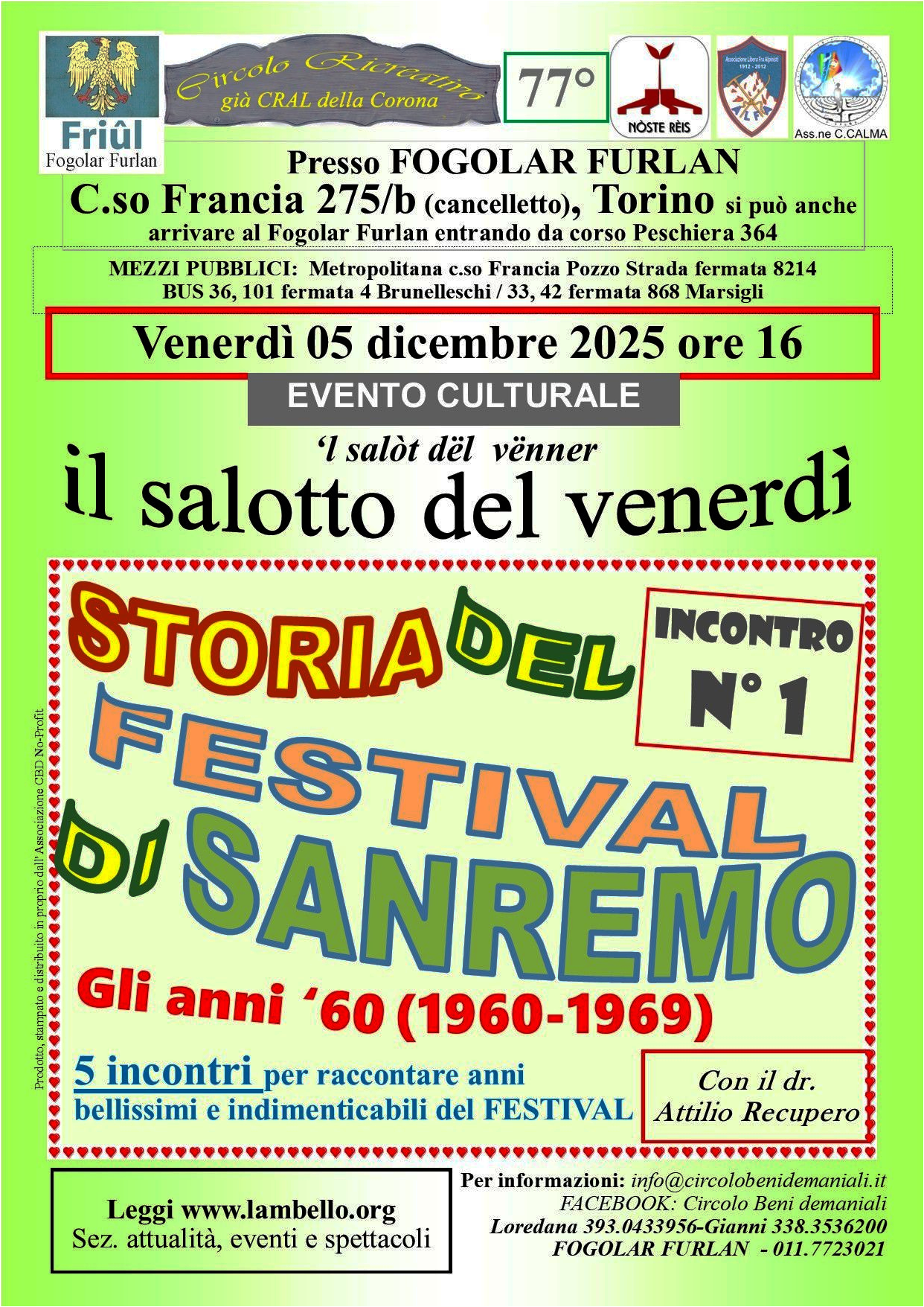 19 DIC VENERDI' ore 16.00 | STORIA DEL FESTIVAL DI SANREMO ANNI '60 SECONDA PARTE Conferenza del dr. Attilio RECUPERO a cura del Circolo ricreativo della Corona | |||