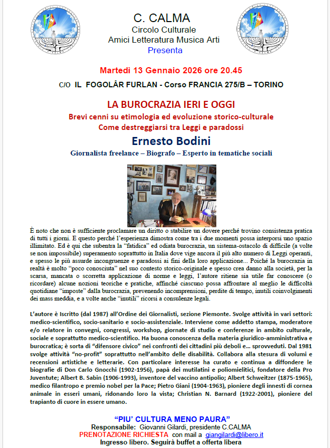 13 GEN MARTEDI' ore 20.45 | Come destreggiarsi tra leggi e paradossi Conferenza del dott. Ernesto BODINI a cura dell'associazione C.CALMA | |||