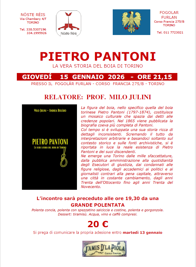 15 GEN GIOVEDI' ore 21.15 | La vera storia del boia di Torino Conferenza del prof. Milo JULINI a cura dell'associazione NÒSTE RÈIS preceduta, alle 19,30, da marenda sinòira a cura de J'AMIS D'LA PIÒLA | |||