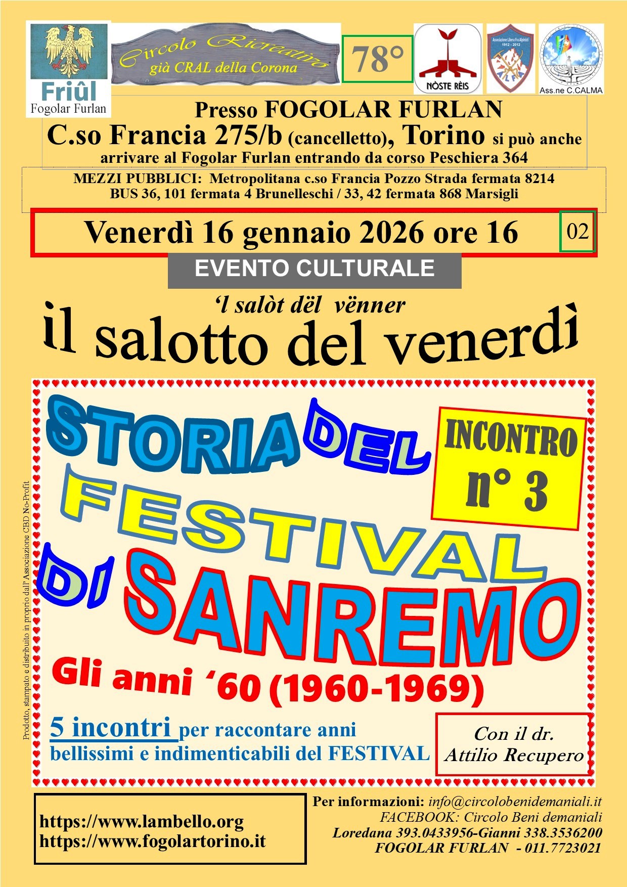 16 GEN VENERDI' ore 16.00 | TERZA PARTE Conferenza del dr. Attilio RECUPERO a cura del Circolo ricreativo della Corona | |||