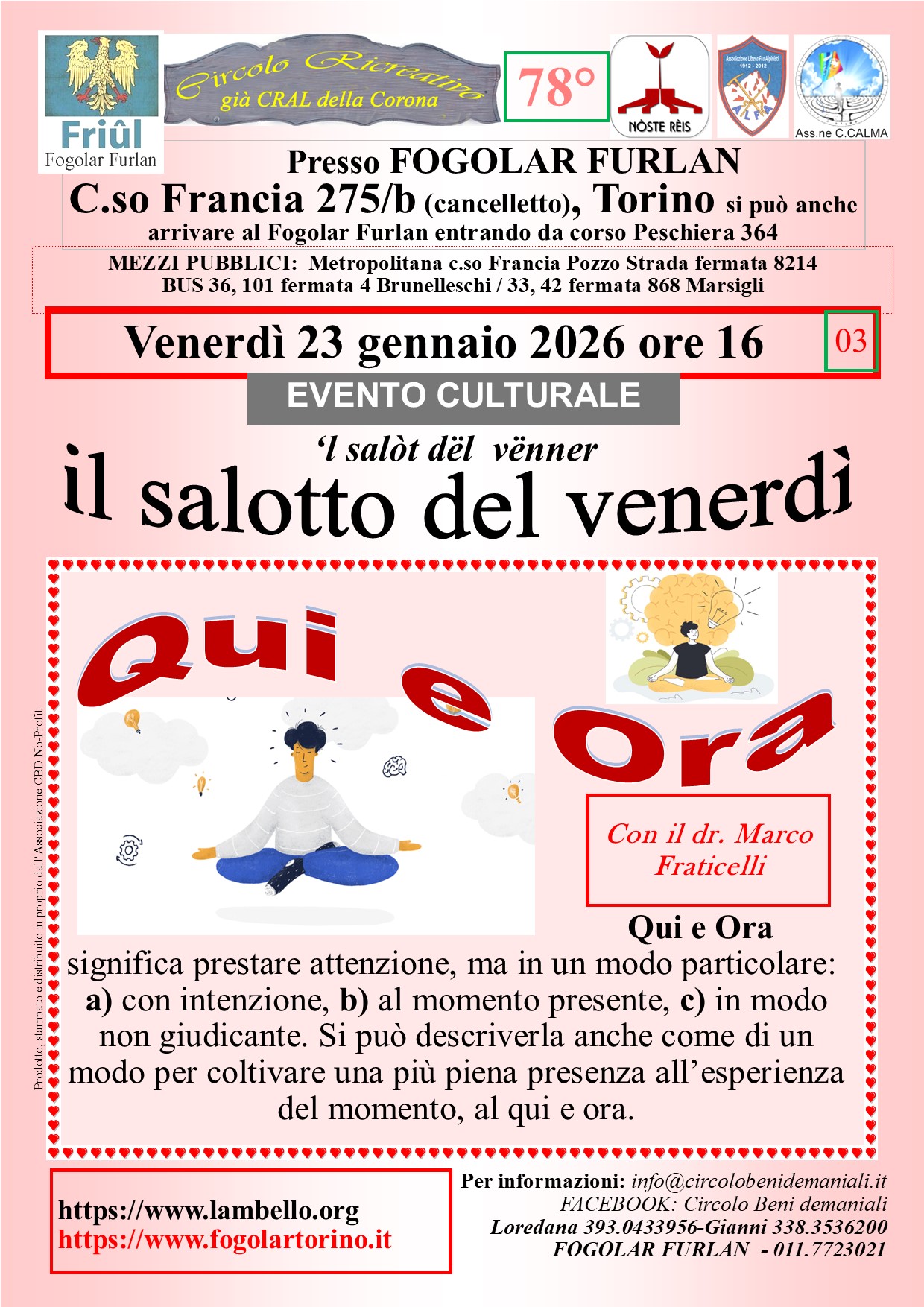 23 GEN VENERDI' ore 16.00 | Ridurre lo stress, l'ansia e la depressione Conferenza del dr. Marco FRATICELLI a cura del Circolo ricreativo della Corona | |||