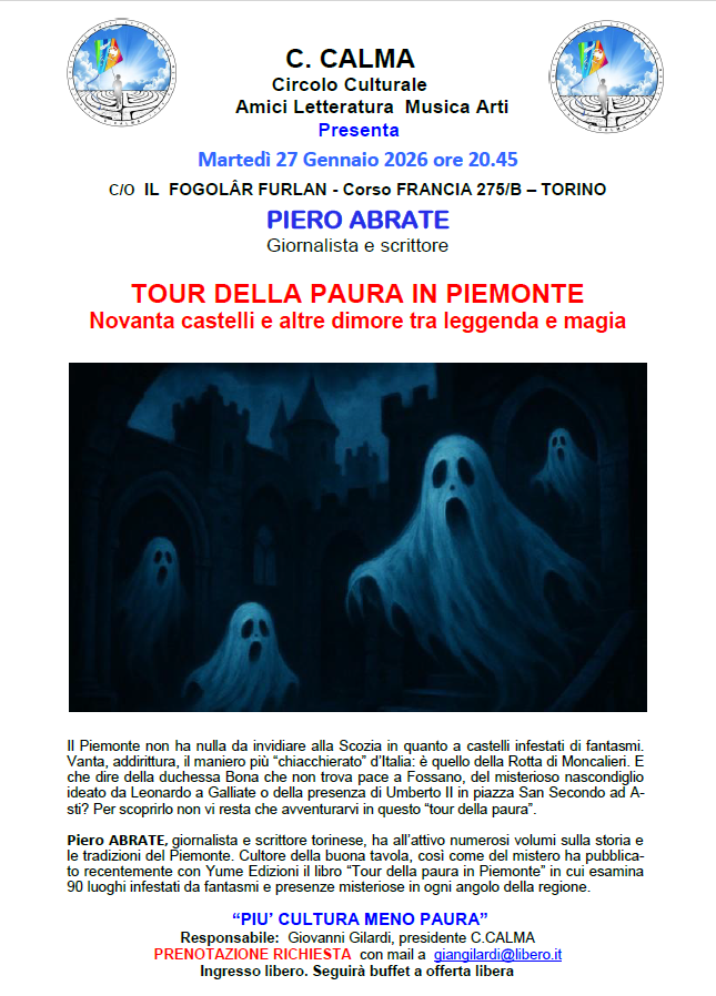 27 GEN MARTEDI' ore 20.45 | Novanta castelli tra leggenda e magia Conferenza di Piero ABRATE a cura dell'associazione C.CALMA | |||