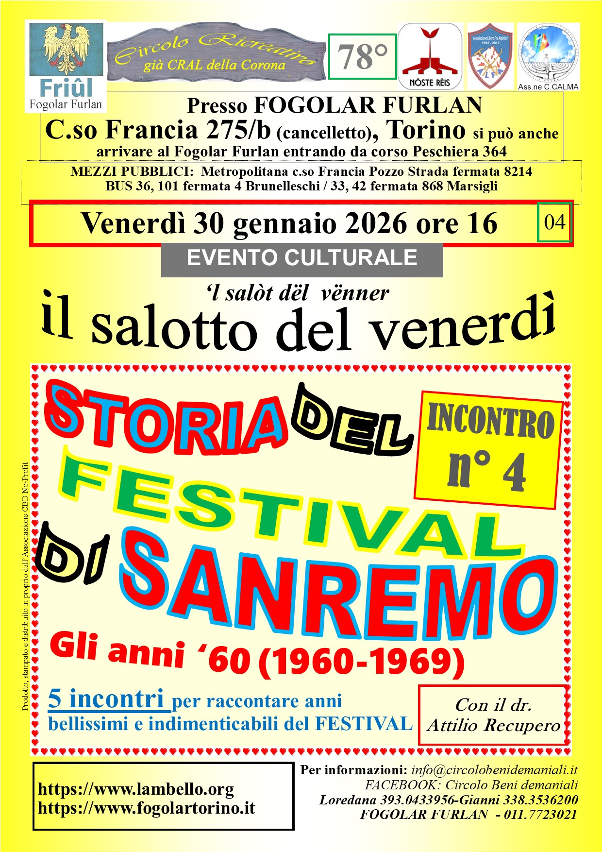 30 GEN VENERDI' ore 16.00 | QUARTA PARTE Conferenza del dr. Attilio RECUPERO a cura del Circolo ricreativo della Corona | |||