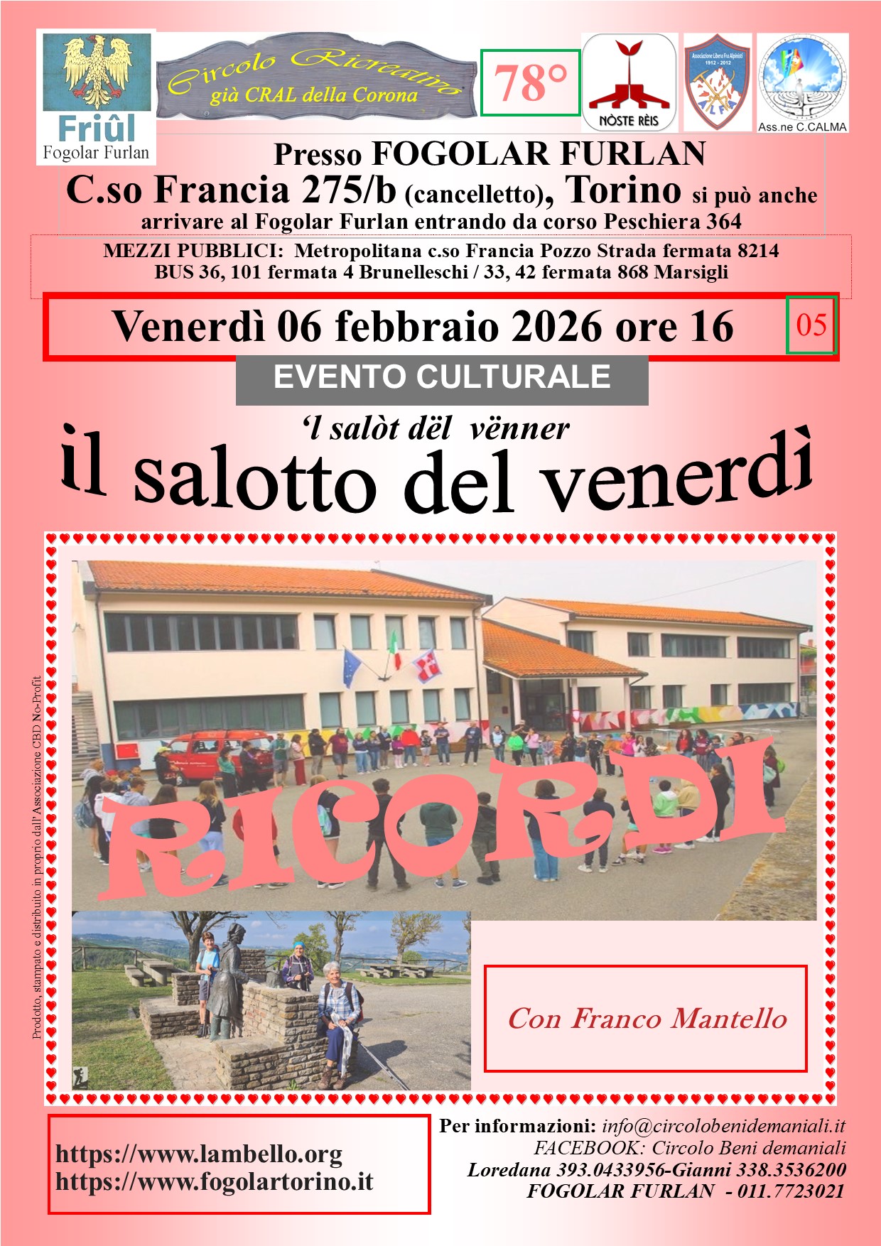 6 FEB VENERDI' ore 16.00 | con Franco MANTELLO a cura del Circolo ricreativo della Corona | |||
