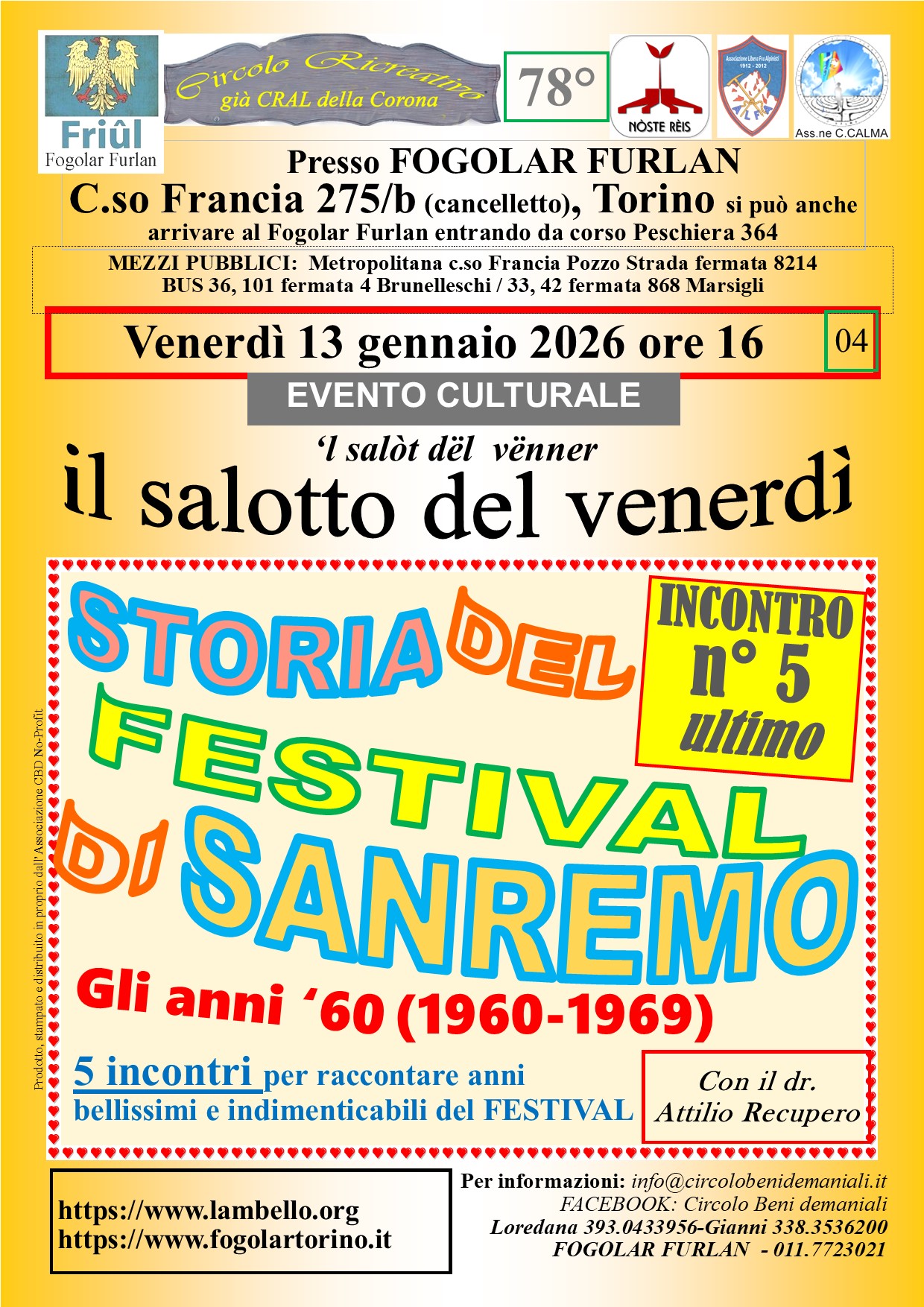 13 FEB VENERDI' ore 16.00 | QUINTA PARTE Conferenza del dr. Attilio RECUPERO a cura del Circolo ricreativo della Corona | |||