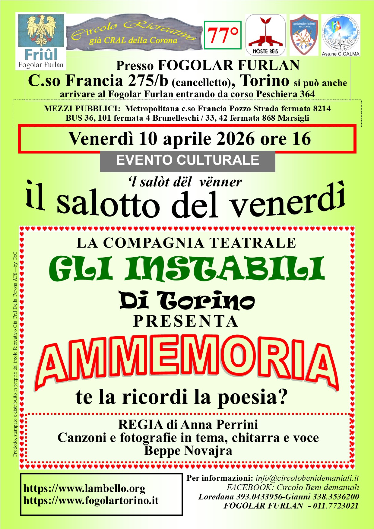 10 APR VENERDI' ore 16.00 | Te la ricordi la poesia? con la compagnia teatrale GLI INSTABILI DI TORINO a cura del Circolo ricreativo della Corona | |||