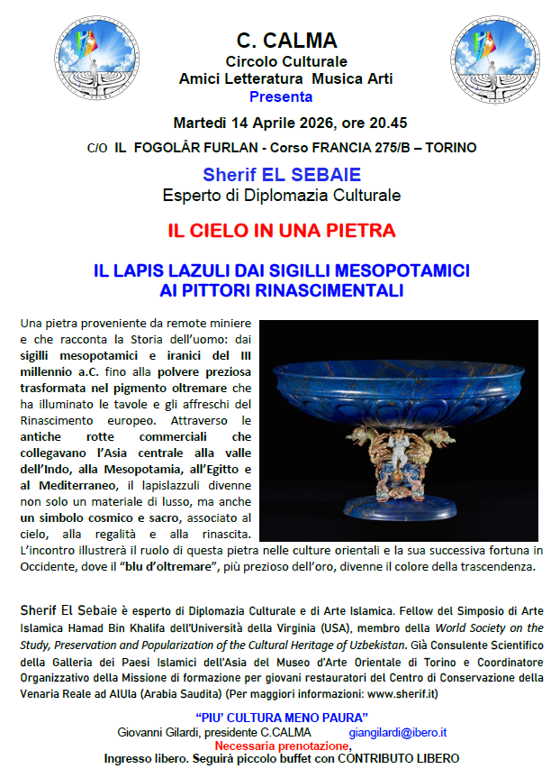 14 APR MARTEDI' ore 20.45 | Il lapis lazuli dai sigilli mesopotanici ai pittori rinascimentali Conferenza tenuta del prof. Sherif EL SEBAIE Esperto di diplomazia culturalea cura dell'associazione C.CALMA | |||