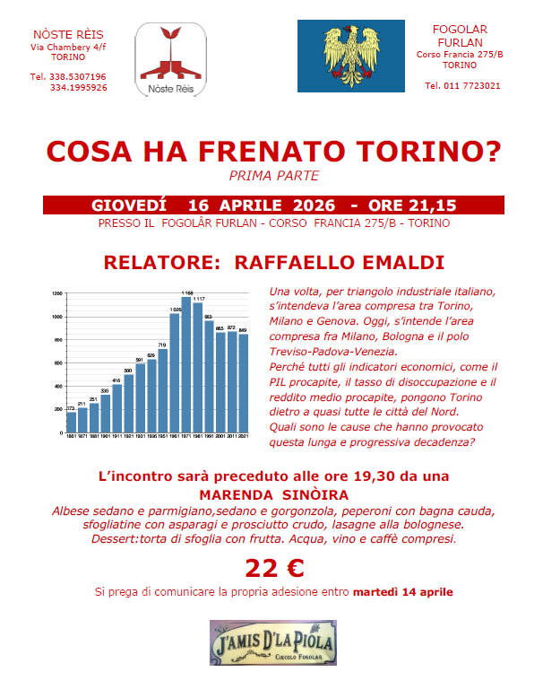 16 APR GIOVEDI' ore 21.15 | PRIMA PARTE Conferenza di Raffaello EMALDI a cura dell'associazione NÒSTE RÈIS preceduta, alle 19,30, da marenda sinòira a cura de J'AMIS D'LA PIÒLA | |||