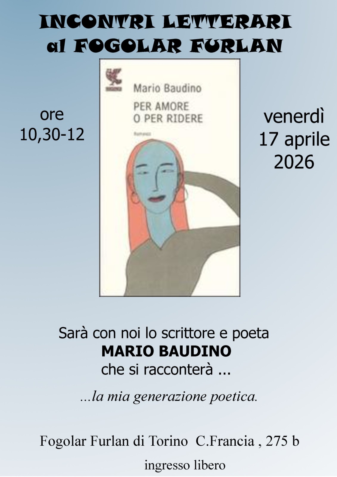 17 APR VENERDI' ore 10.30 | presentazione del libro "PER AMORE O PER RIDERE" tenuta dall'autore Mario BAUDINO a cura dell'associazione FOGOLAR FURLAN | |||