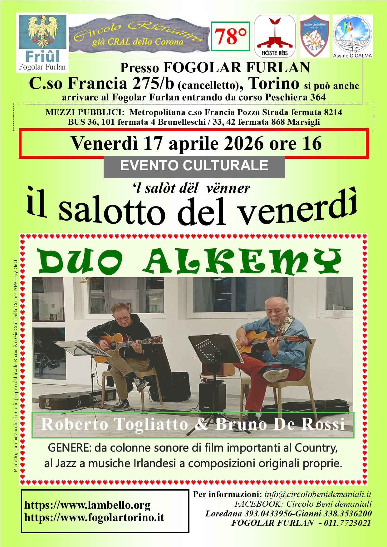 17 APR VENERDI' ore 16.00 | da colonne sonore al Country al Jazz a musiche irlandesi Roberto TOGLIATTO & Bruno DE ROSSI a cura del Circolo ricreativo della Corona | |||