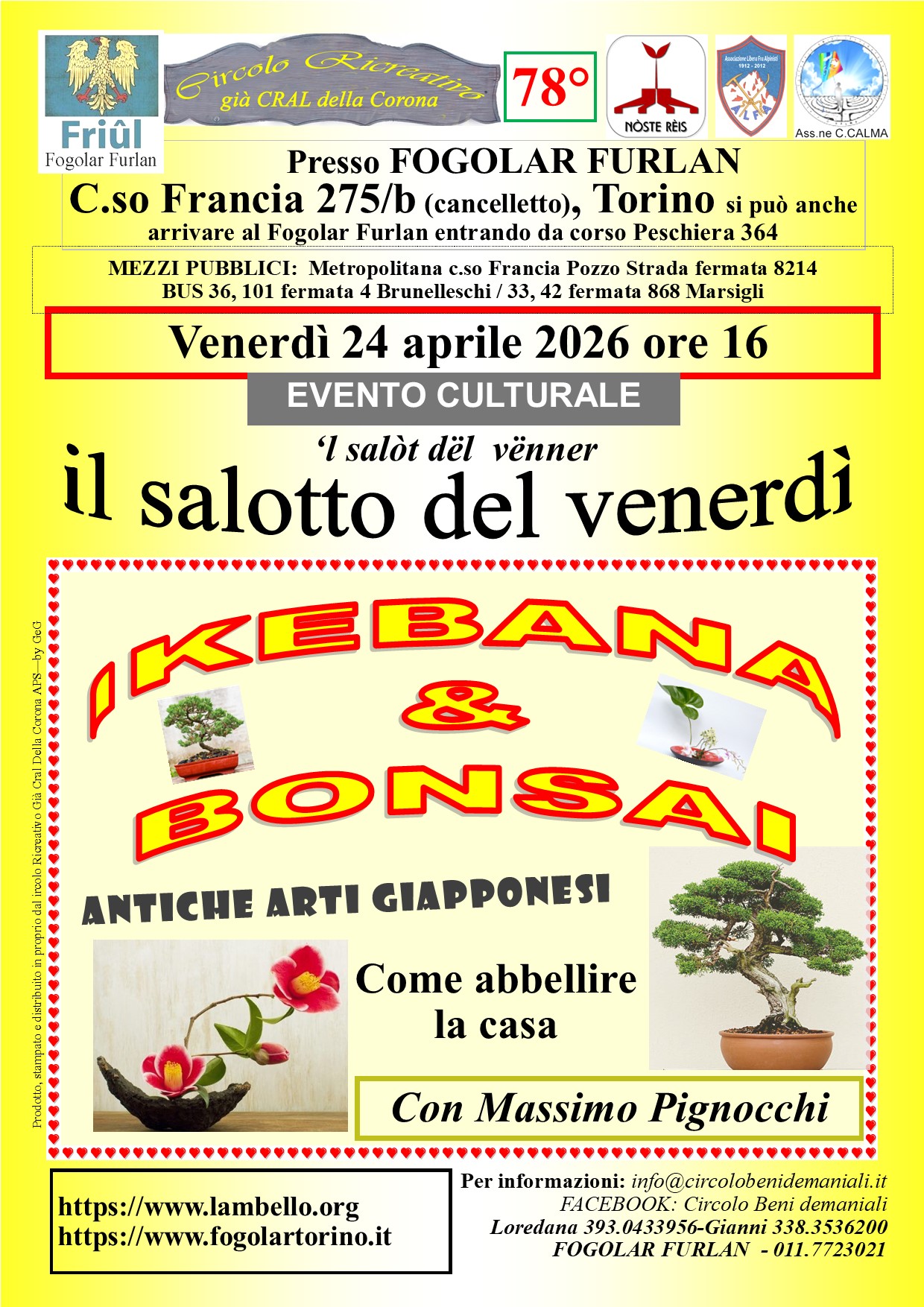 24 APR VENERDI' ore 16.00 | Antiche arti giapponesi - come abbellire la casa Conferenza di Massimo PIGNOCCHI a cura del Circolo ricreativo della Corona | |||